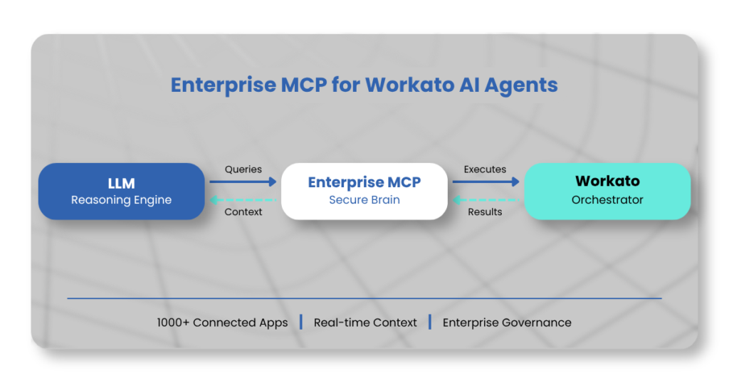 Standard automation is linear. It follows a script. But production-ready AI requires context. Enterprise MCP acts as the “secure brain” for your Workato environment, allowing Large Language Models (LLMs) to understand your data permissions, schemas, and business logic in real-time.